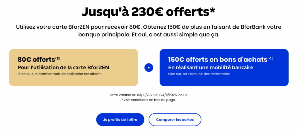 L’offre BforBank se démarque par sa flexibilité et sa générosité : jusqu’à 230 € offerts, aucune condition de revenus et une ouverture de compte 100 % en ligne.
