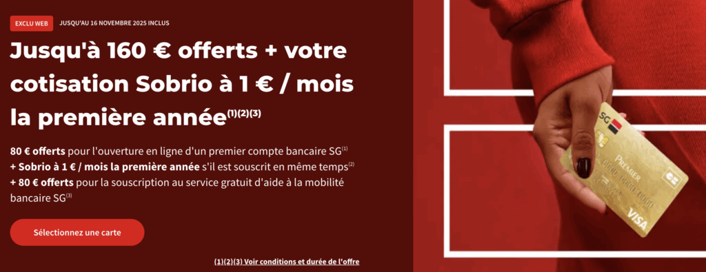La Société Générale propose une offre d’accueil claire et compétitive : jusqu’à 160 € offerts, dont 80 € à l’ouverture de compte, et un pack Sobrio à 1 €/mois pendant un an.